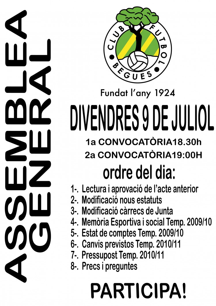 A tots els socis i socies del Club de Futbol Begues, s'informa que l'assemblea general ordinària d'aquesta temporada tindrà lloc el proper divendres 9 de juliol a les 18:30h en primera convocatòria i a les 19:00h en segona convocatòria a la SALA ANEXA
