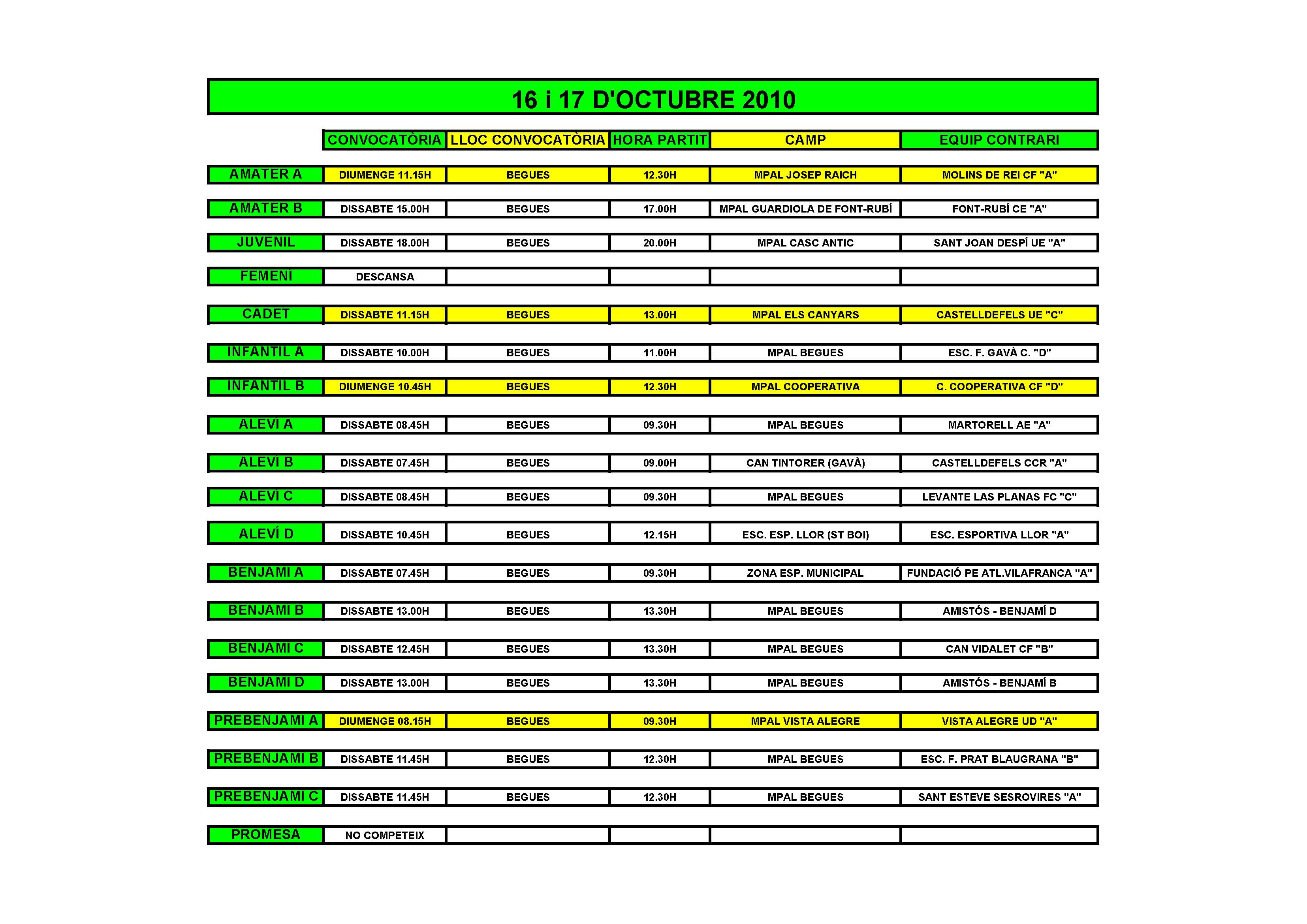 *Actualització (13/10/2010 17:43h): S'ha modificat el Calendari de l'equip PreBenjamí A on hi havia un error. El partit es disputarà al Camp de Vista alegre a Castelldefels, i no a Begues.