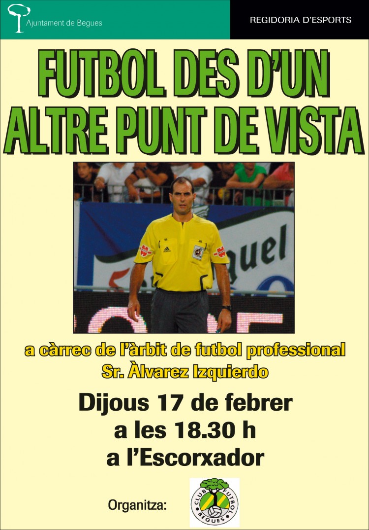 Recordeu la mítica frase "no hase falta que tu dises nada más"? La va dir Bernd Schster, aleshores entrenador del Madrid, després de preguntar als periodistes que d'on era l'àrbitre que els havia xiulat i que aquests responguessin que era català. Doncs ara li podreu preguntar a aquest àrbitre, Álvarez Izquierdo, que va pensar quan ho va sentir i moltes altres preguntes que volgueu fer-li, ja que el dijous dia 17 de febrer farà una conferència al nostre poble, titulada"Futbol des d'un altre punt de vista" Concretament serà a l'escorxador, a les 18:30, en un acte organitzat pel CFBegues amb la col-laboració de l'ajuntament de Begues