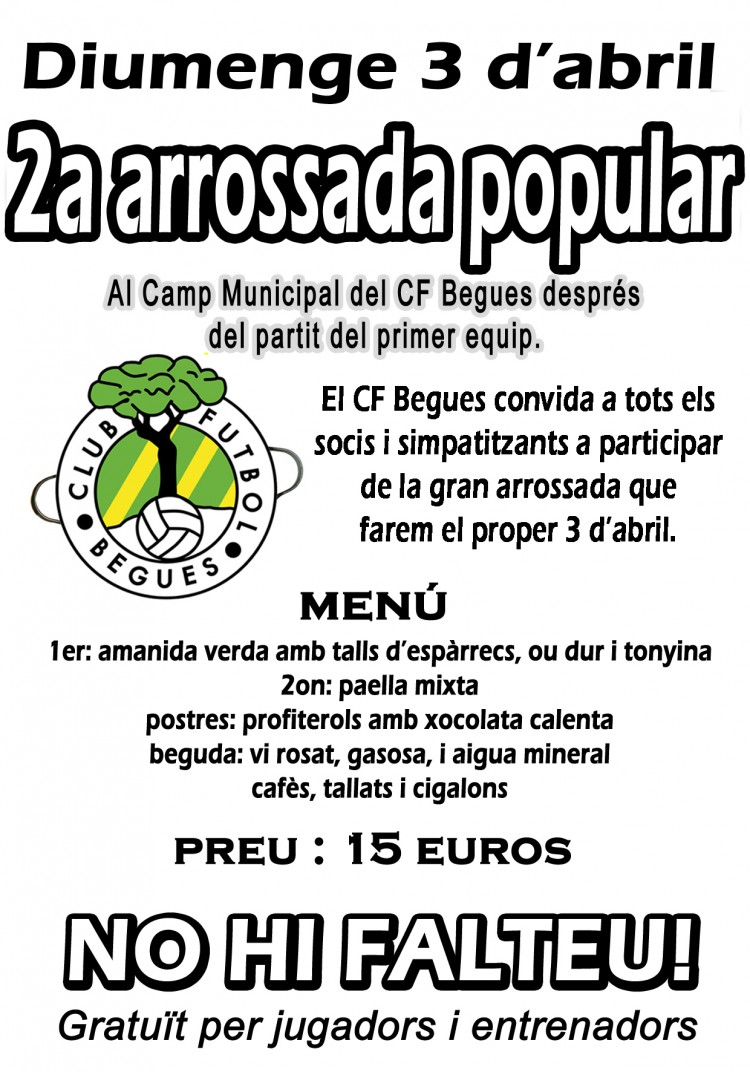 Després de l'èxit de la primera edició l'any passat. la directiva del CFBegues està organitzant la 2a arrossada popular del club per al diumenge 3 dàbril, després del partit del primer equip amb el Torrelles. Ja us hi podeu inscriure, adquirint els tickets a les oficines del club de dimarts a divendres de 18 a 20 hores. El plaç d'inscripcions finalitza el divendres 25 de març