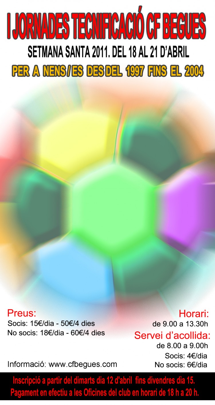 Per aquesta setmana santa, el CFBegues ha organitzat unes jornades per a que els nens i nenes nascuts entre el 1997 i el 2004 puguin millorar aspectes tècnics i tàctics del futbol, així com seguir gaudint de l'esport i dels companys. Aquí teniu tota la informació sobre els objectius, edat, calendaris, programació, inscripcions, preus...