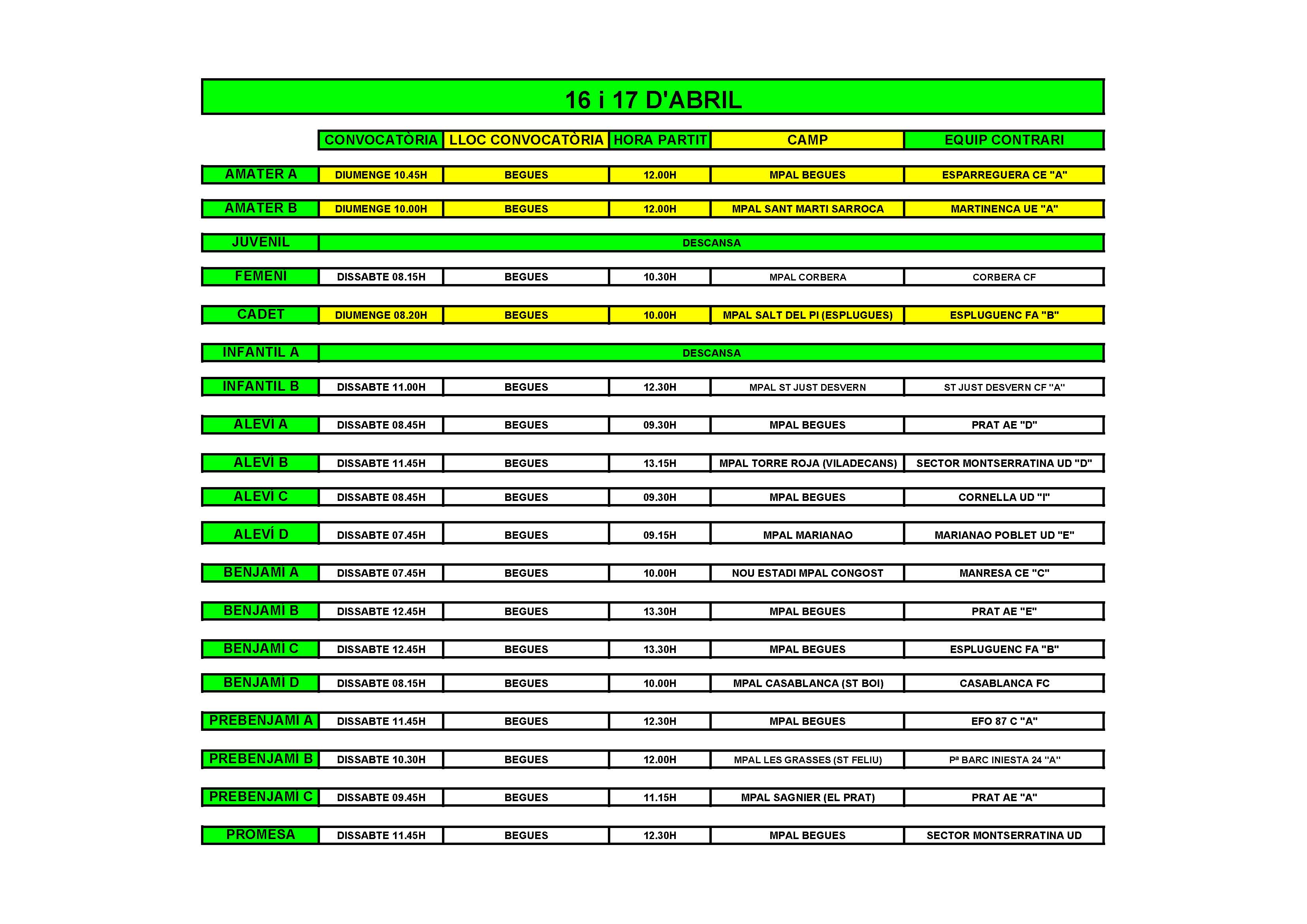 - Partits per al cap de setmana del 16 i 17 d'Abril
