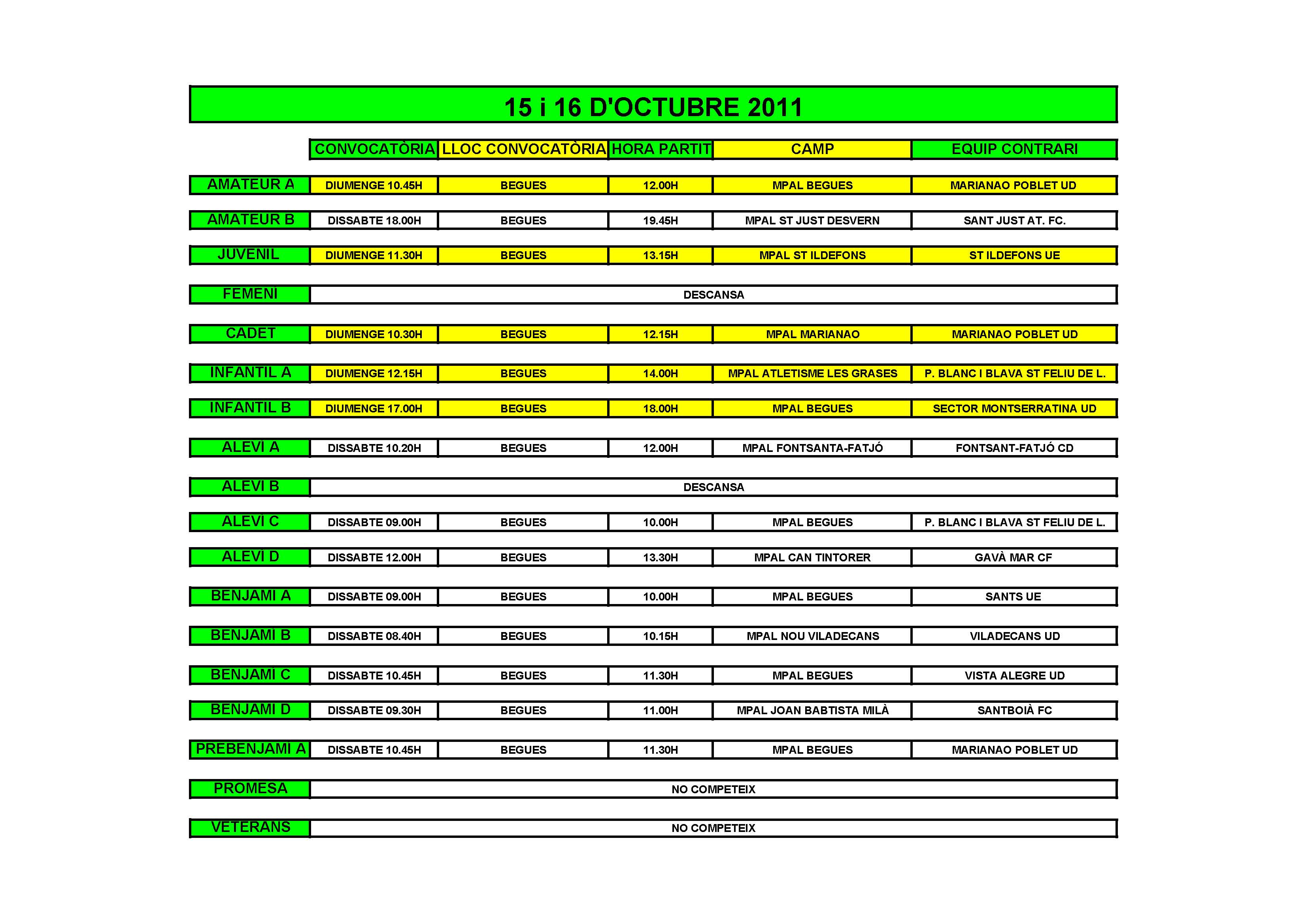 - Partits el cap de setmana del 15 i 16 d'Octubre