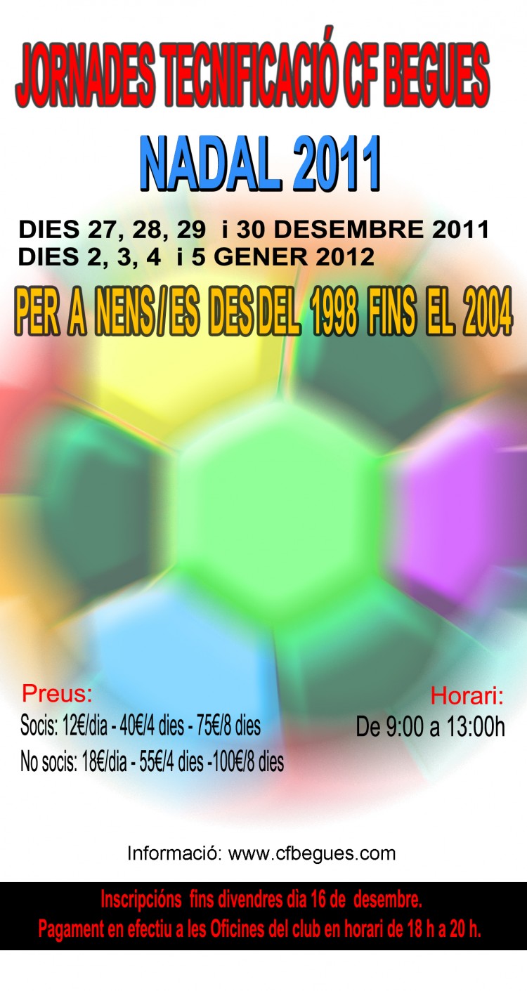No saps què fer aquest Nadal? Vols jugar a futbol cada dia, durant tot el matí des que s'acabi l'any fins que comenci el 2012? Si vols continuar gaudint del futbol i aprendre amb els coordinadors del CF Begues, apunta't ja a les oficines del club!Aquest Nadal el CF Begues organitza per primera vegada unes jornades de tecnificació en dates nadalenques. Aquesta activitat va adreçada a nenes i nens nascudes des de 2004 fins 1998 (ambdós inclosos). Cada grup d'edat dependrà d'un nombre mínim d'inscripcions. Les jornades tindran lloc el dies 27, 28, 29 i 30 de desembre de 2011 i 2, 3, 4 i 5 de gener de 2012 en horari de 9 a 13h. Tota la informació a les oficines del Club de 18 a 20h fins el 21 de desembre.
