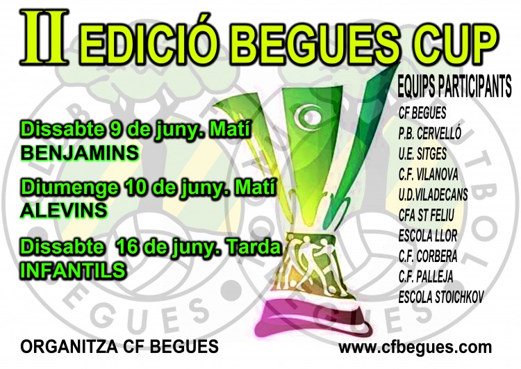 Aquest dissabte dia 9, al matí, comença la segona edició de la Begues Cup, competició amistosa que organitza el nostre club en les categories de benjamins, alevins i infantils. Diumenge 10 (al matí) i dissabte 16 de juny (a la tarda) seran els altres dies en que es disputarà aquest torneig. Hi haurà un gran cartell, amb la participació del Sitges, el Vilanova, el Viladecans, PBCervelló, CFA Sant Feliu, Corbera, Escola Llor, Pallejà i l'escola Stoichkov