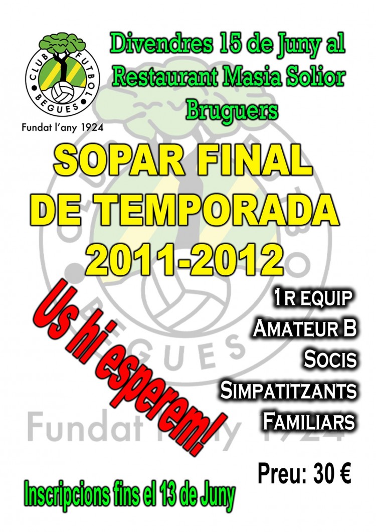 El proper divendres 15 de juny al Restaurant Solior de Bruguers es celebrarà el tradicional sopar de final de temporada, en el que hi assistiran els equips amateurs del club, el primer equip i el B, així com tots els familiars, socis i simpatitzants que ho vulguin amb un preu de 30 euros. En el sopar s'entregaran els tradicionals obsequis a jugadors, entrenadors, delegats i fisios, i al final hi haurà música per a qui s'animi a ballar. Fins al 13 de juny teniu temps per a fer la inscripció