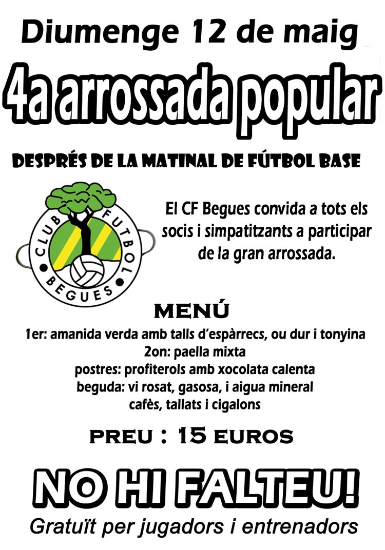 El CF BEGUES convida a tots els socis i aficionats al club a participar a la IV Arrossada el proper diumenge 12 de maig de 2013, despres de la jornada matinal de futbol basePEr a més informació i comprar tickets us podeu apropar a les oficines del club, de dilluns a divendres, de 5:30 a 8:00pm.
