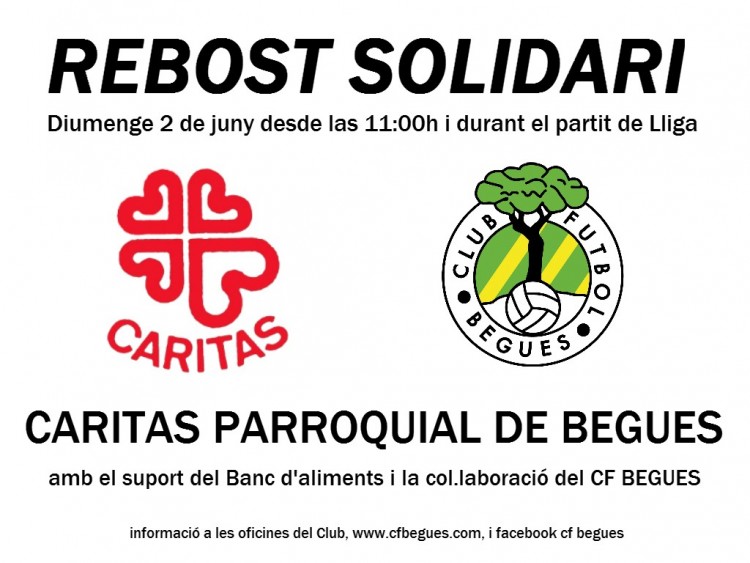 Aquest diumenge 2 de juny des de les 11.00h i durant el partit de lliga del primer equip, CARITAS PARROQUIAL DE BEGUES organitza amb la col.laboració del CF Begues i el suport del Banc d´aliments un rebost solidari. Si teniu farina, sucre, oli, llegums, etc..els podreu dipositar en unes caixes distribuides pel Municipal per fer una recolecta d´aliments per la gent necessitada de Begues.