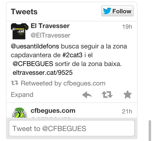 Ja tornem a tenir en funcionament l'apartat Tweeter de la nostra web. A la part de baix a la dreta de la portada hi trobareu una finestreta amb els darrers tweets del compte del CFBegues En aquesta xarxa social. Encara que no tingueu tweeter, des de la web hi podreu trobar resultats gairebé en directe de partits que la gent o el compte @CFBegues penja, enllaços amb altres webs de futbol amb prèvies del grup del Begues i moltes altres coses que la gent pot comentar.