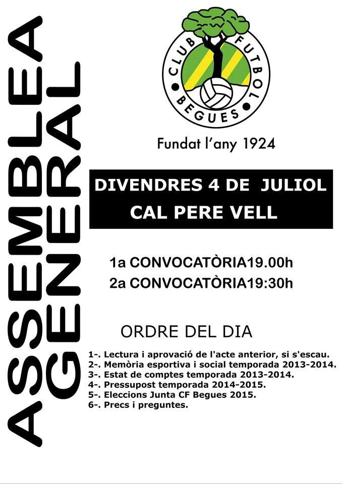 El proper dia 4 de juliol a les 19:00 el CFBegues farà la seva Assemblea General Ordinària a Cal Pere Vell. Socis i sòcies, esperem la vostra assistència!