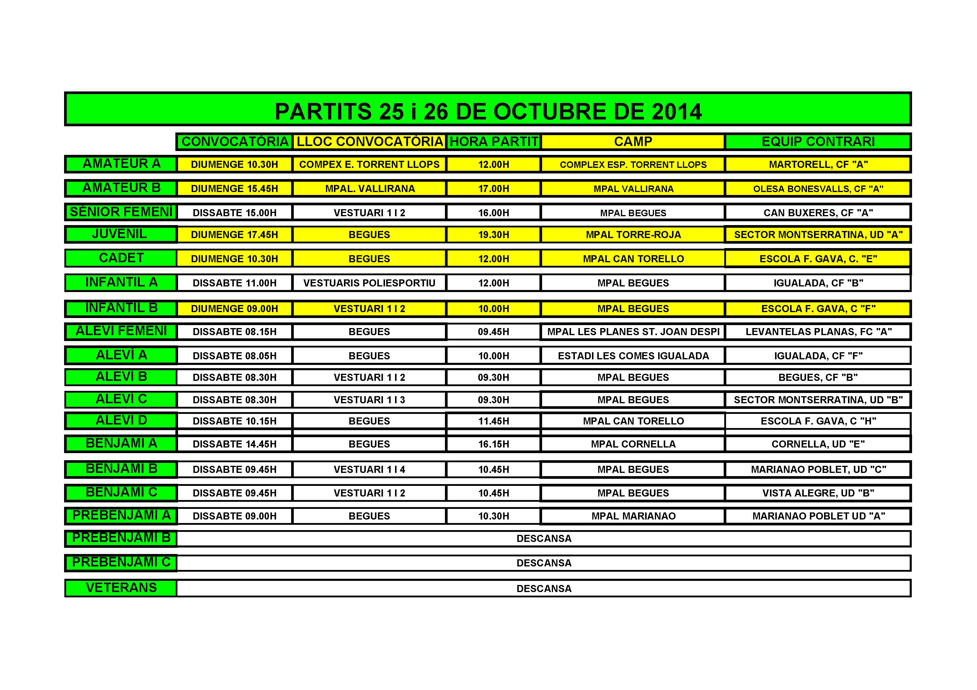 Calendari de partits per al cap de setmana del 25 i 26 d'Octubre