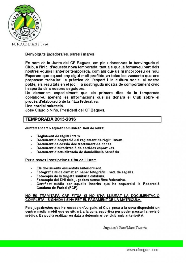 Adjuntem el full d'inscripció per als jugadors per a la temporada 2015-16 amb tota la informació necesaria