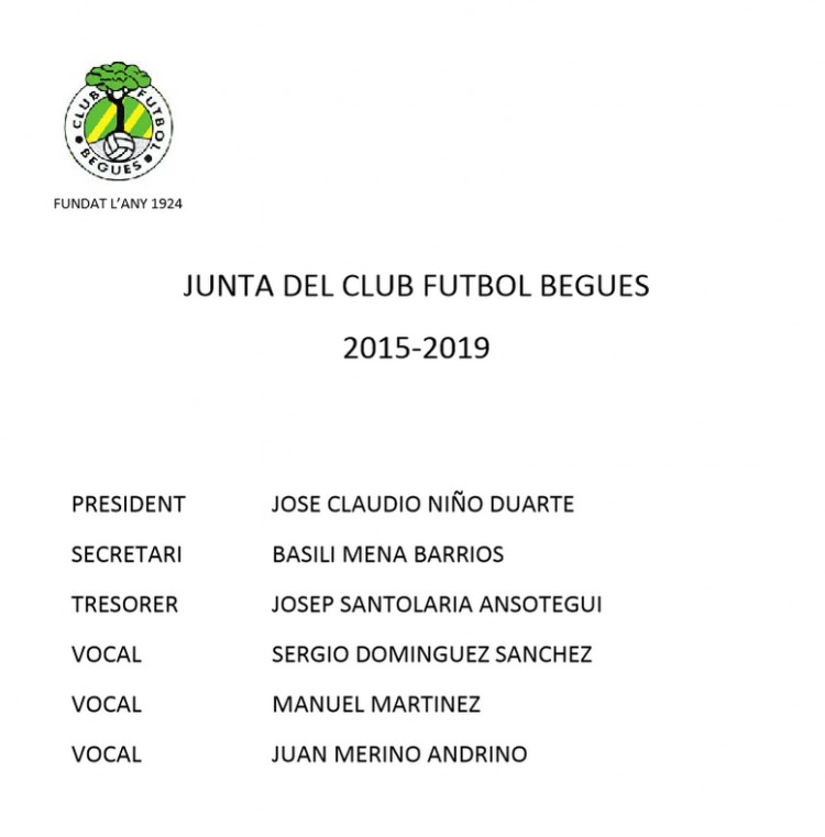 A l'Assemblea General del 3 de Juliol de 2015 es va presentar i ratificar la nova Junta del CF BEGUES per al període 2015-2019, la qual comptarà amb els següents membres: Claudio Niño Duarte com a President, Basili Mena Barrios com a Secretari, Josep Santolaria com a Tresorer, Sergio Dominguez, Manuel Martinez i Juan Merino com a Vocals.