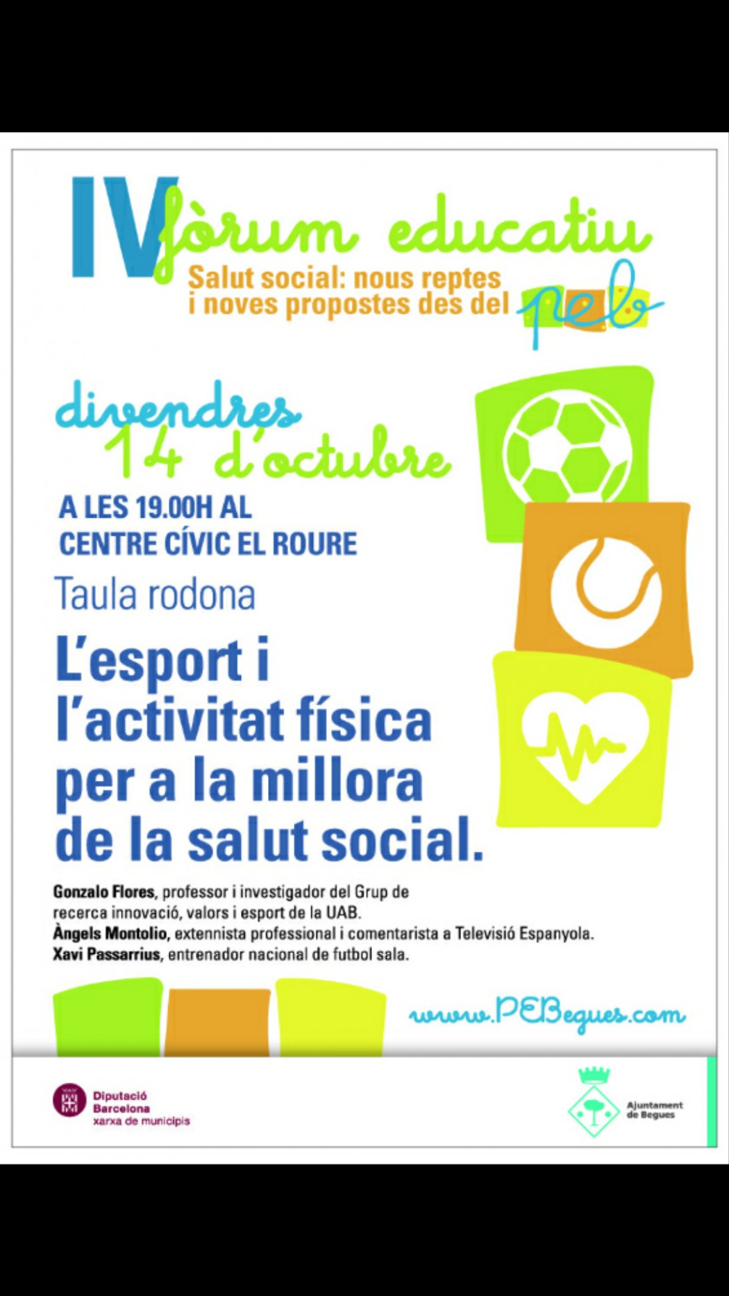 Aquest divendres, 14 d’octubre a les 19.00 h, començarà el projecte de l’Eix d’Esports i l’Activitat Física del Projecte Educatiu de Begues amb una Taula rodona al Centre Cívic El Roure. Participaran a la sessió: Gonzalo Flores, professor i investigador del Grup de Recerca sobre innovació, valors i esport de la UAB, i els nostres conciutadans: Àngels Montolio, extennista professional i comentarista a Televisió Espanyola, i Xavi Passarrius, entrenador nacional de fútbol sala.