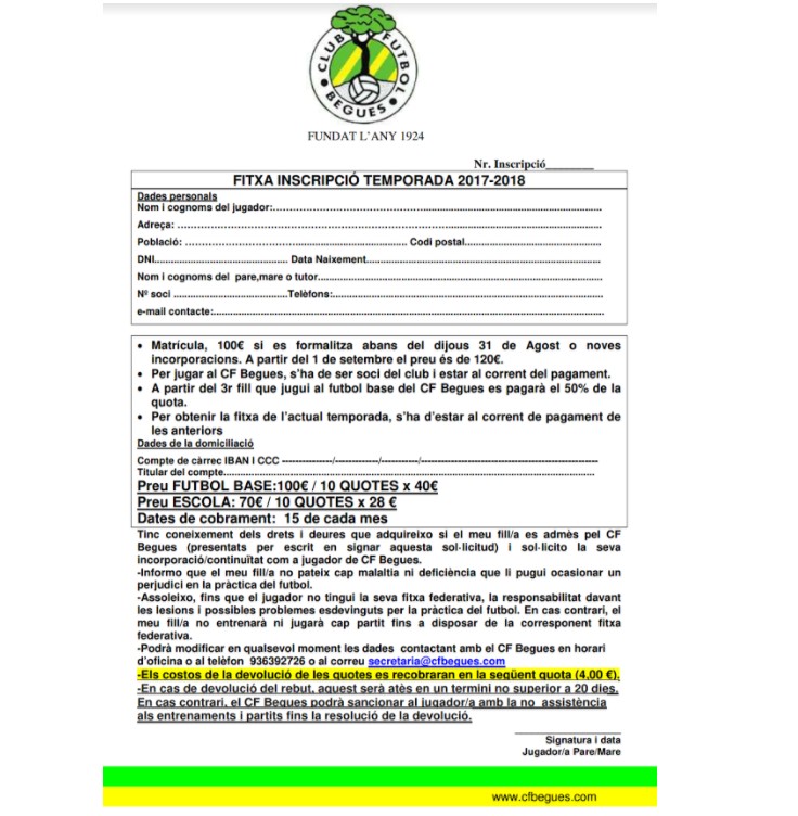 Aqui teniu el full d'incripció per a la Temporada 2017-2018 (hi ha dues fulles, l'altre la trobareu a l'apartat de fotos)Els horaris seran els següents:24 a 28 de juliol de 18 a 20 hores7 a 11 d'agost de 19 a 20 hores28 d'agosto a 1 de Setembre de 18 a 20 horesUs esperem!