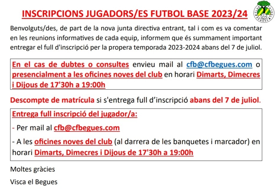 Podeu enviar la inscripció a cfb@cfbegues.com