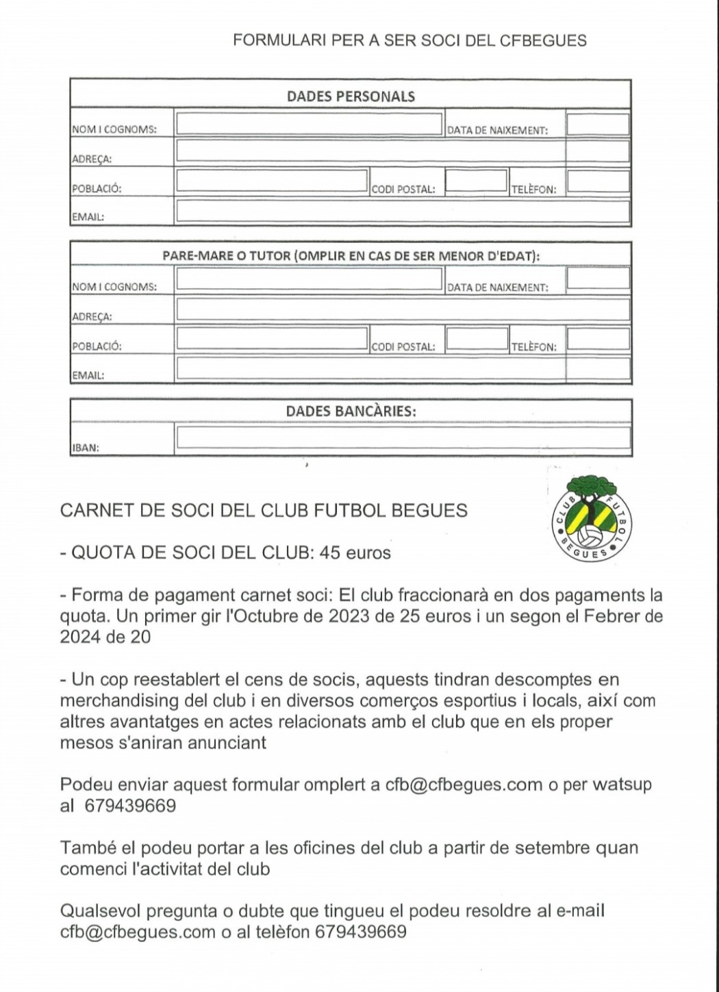 Hem començat la feina de Regularització del Cens de Socis del club, i t'agrairiem que omplis el formulari i l'enviis per watsup al 679439669 o per mail cfb@cfbegues.com. O en persona als membres de la junta o a les oficines del club a partir de setembre