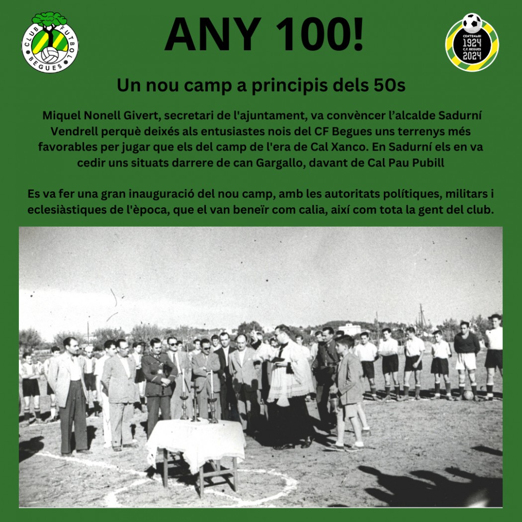 A principis dels 50s, el futbol despertava grans passions. A Begues, en aquells anys, hi va haver un secretari a l'Ajuntament a qui li agradaven molt els esports, Miquel Nonell Givert. Ell va convèncer l’alcalde, Sadurní Vendrell, perquè deixés als entusiastes nois del CF Begues uns terrenys més favorables per jugar que els del camp de l'era de Cal Xanco.