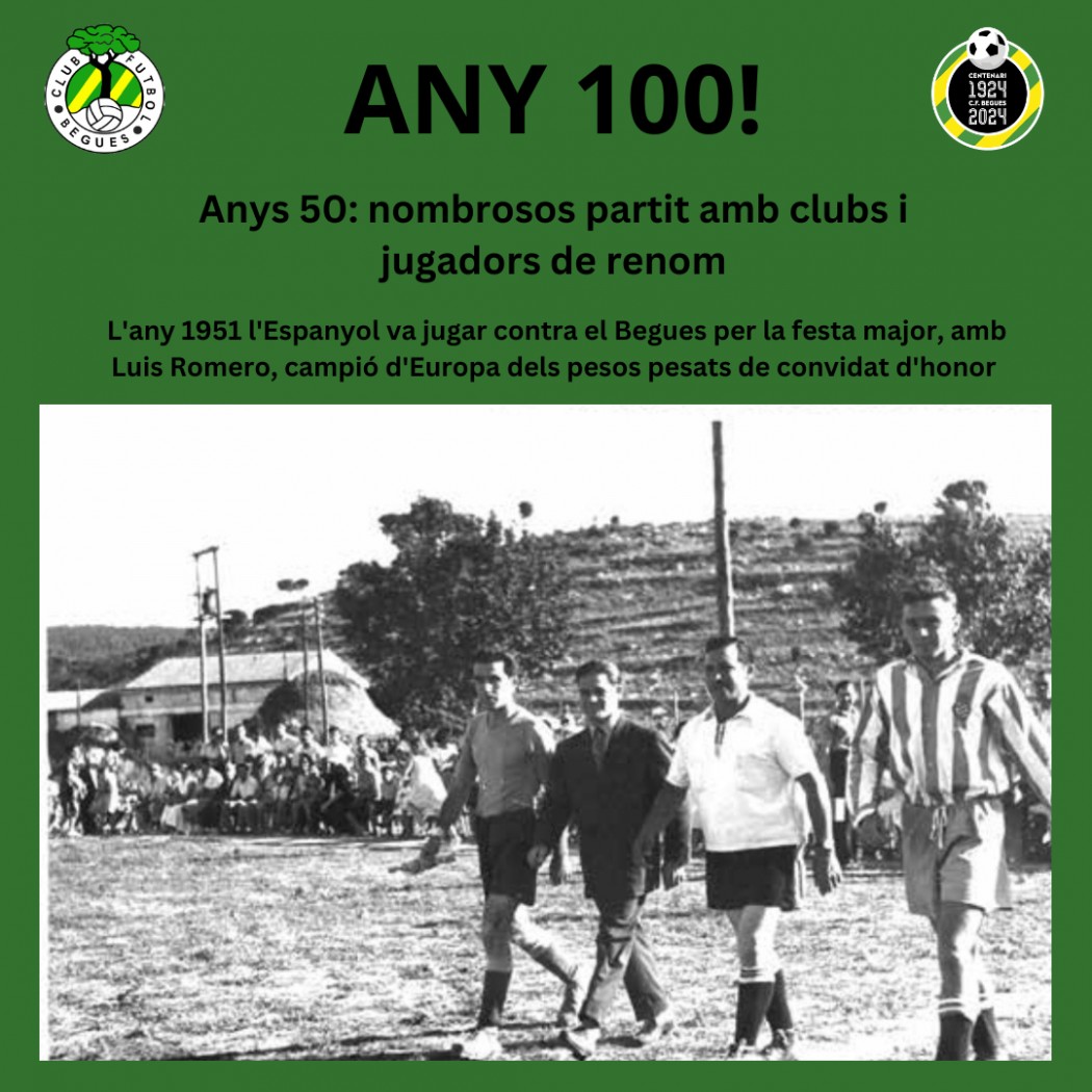 Els anys 50, el futbol ja movia masses i la gent el vivia amb passió. El Begues es va saber moure per a fer pujar a jugar equips de renom, com l'Espanyol, el FCBarcelona Atlètic o jugadors que acceptaven jugar algun partit amistós amb el CFBegues