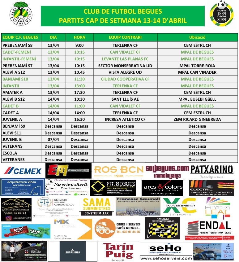 Partits dels nostres equips el cap de setmana del 13 i 14 d'Abril. Sort a tots i totes!