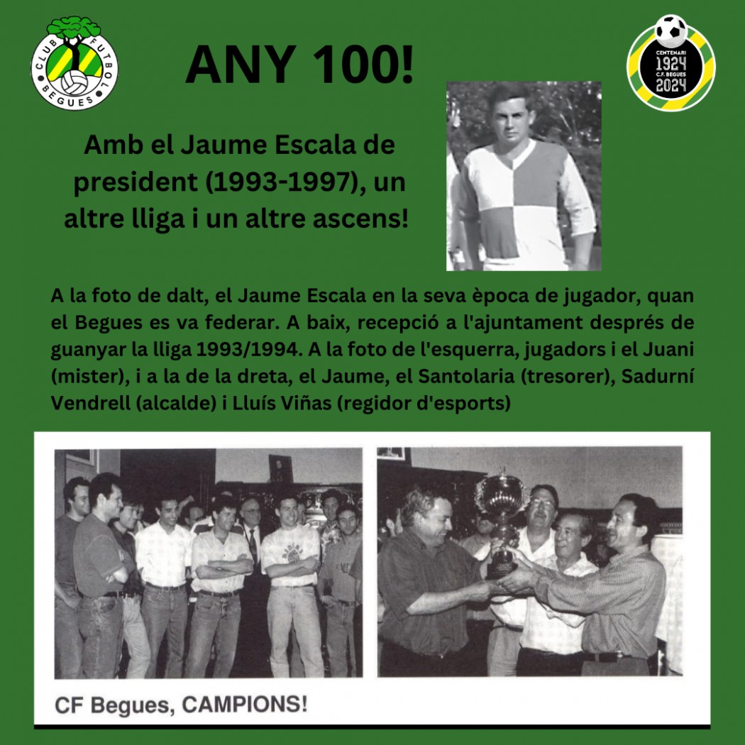Calia trobar un home que aportés serenitat al CF Begues i acceptés el repte de treure al club de la situació per tirar endavant. Aquest home va ser Jaume Escala i Ventura, exjugador, poc aficionat als càrrecs però amb un sentit que l'obligava amb els seus convilatans i amb el propi Club que ell havia ajudat a refundar, a cercar un consens.