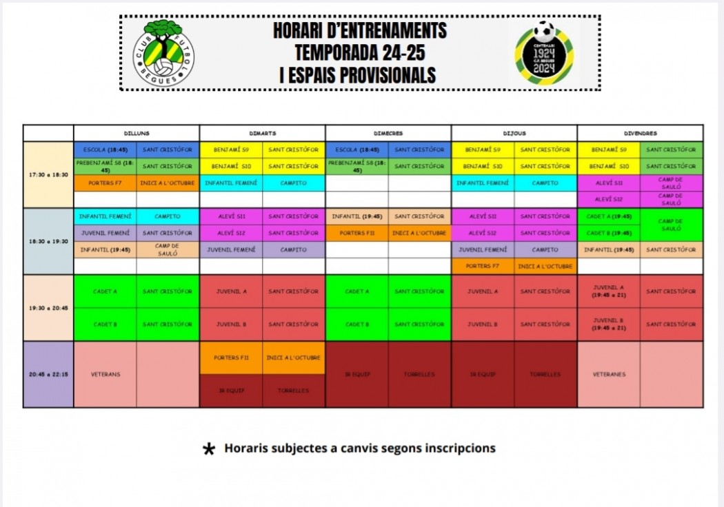 A la imatge teniu els horaris amb els espais on entrenarà cada equip. Pot ser que un equip sempre