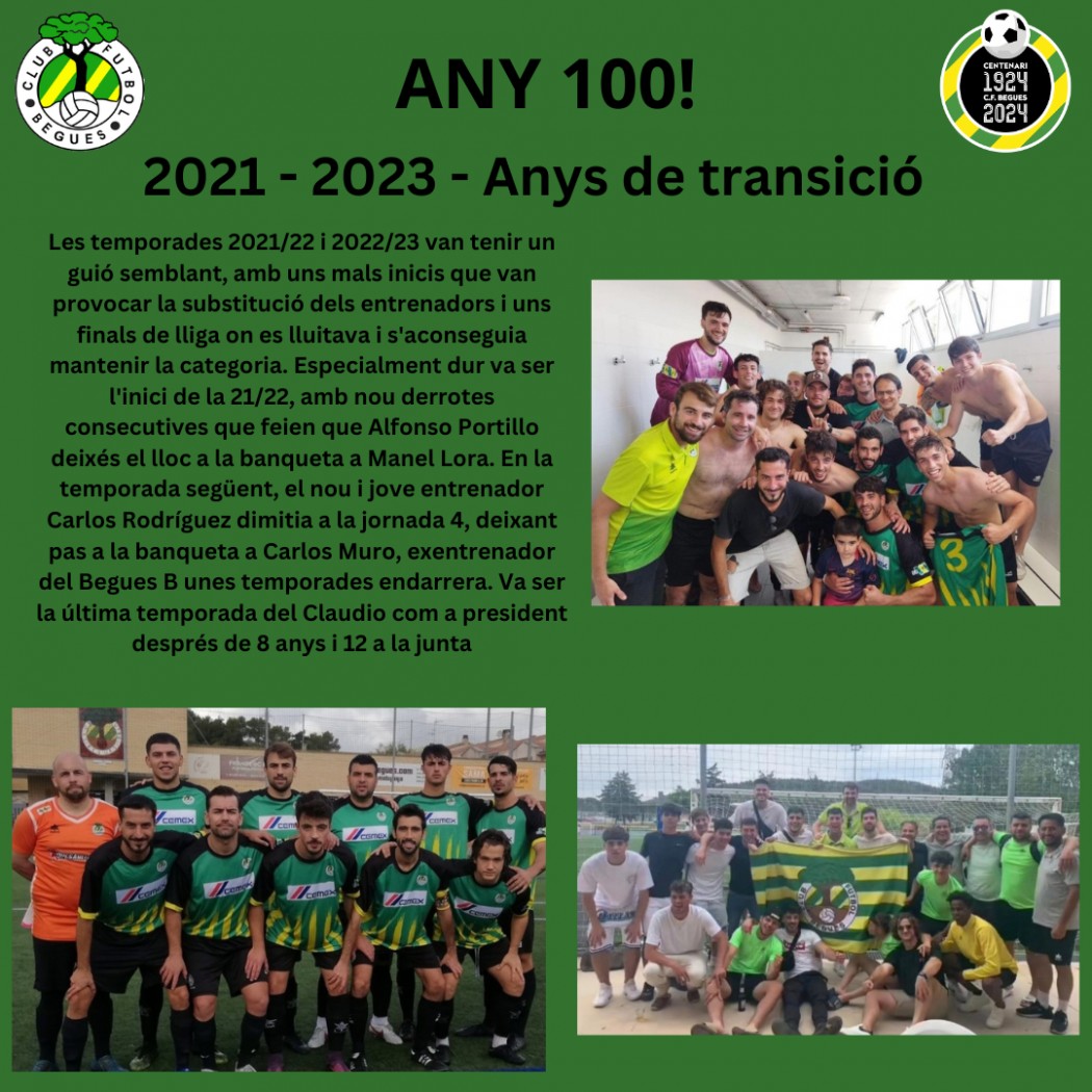 El Begues començava la temporada 2022/2023 amb nou entrenador, Carlos Rodríguez, jove míster que pujava amb una sèrie de jugadors de la seva confiança. Però ben aviat va canviar el rumb de la temporada, quan després d'una victòria i dues derrotes va decidir deixar la direcció de l'equip. Molts dels jugadors que va pujar el nou entrenador van anar deixant l'equip, que es va quedar amb el gruix de la plantilla de jugadors de la pedrera. Un vell conegut del club, Carlos Muro, que ja havia entrenat al Begues B uns quants anys abans, va agafar el timó del vaixell. Els seus dos primers partits van acabar amb un empat davant de l'Incresa i una important victòria a Olesa de Montserrat. El Begues no va patir tant com en la temporada anterior, ja que l'equip va tenir una brillant ratxa de 5 victòries i un empat que l'allunyaven definitivament del perill i el situaven tranquilament a la classificació. Després l'equip es va deixar anar en les darreres jornades, i en l'últim partit de lliga, el Sector Montserratina es va proclamar Campió guanyant 0-5 al municipal. L'equip va acabar finalment 11è amb 44 punts. Aquesta temporada va ser la darrera amb Claudio de president després de 8 anys en el càrrec i 12 a la directiva del club