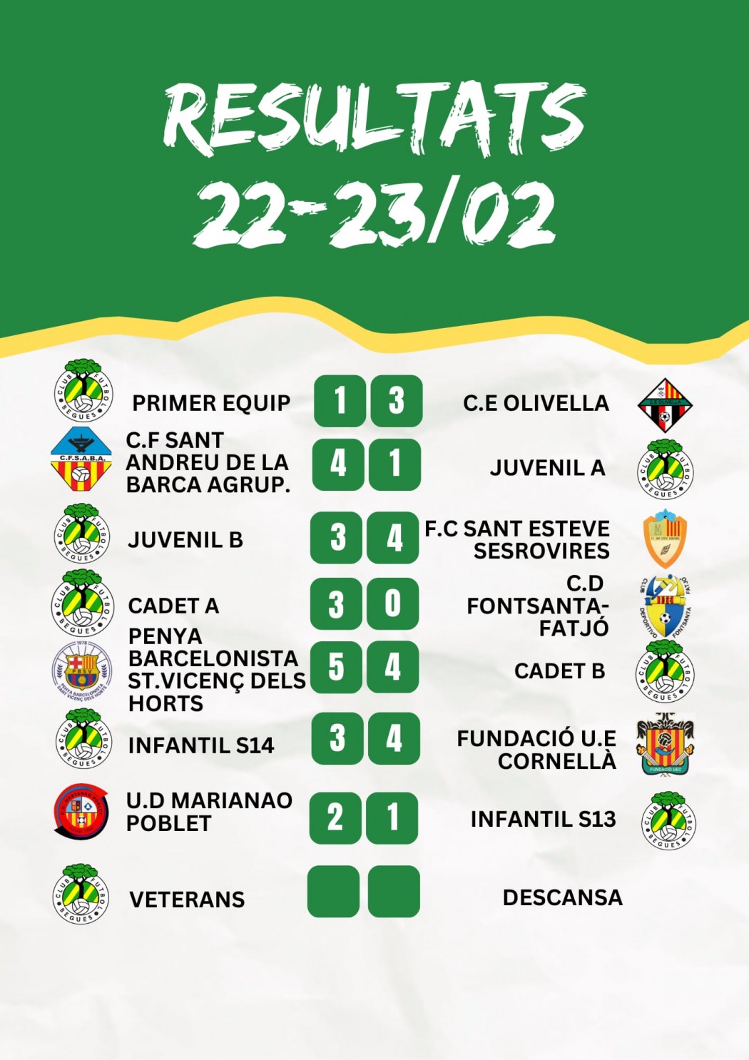 - Juvenil A: Derrota contundent a Sant Andreu de la Barca on tot i avançar-nos en el marcador, els locals van acabar capgirant el marcador per quedar-se amb els tres punts.