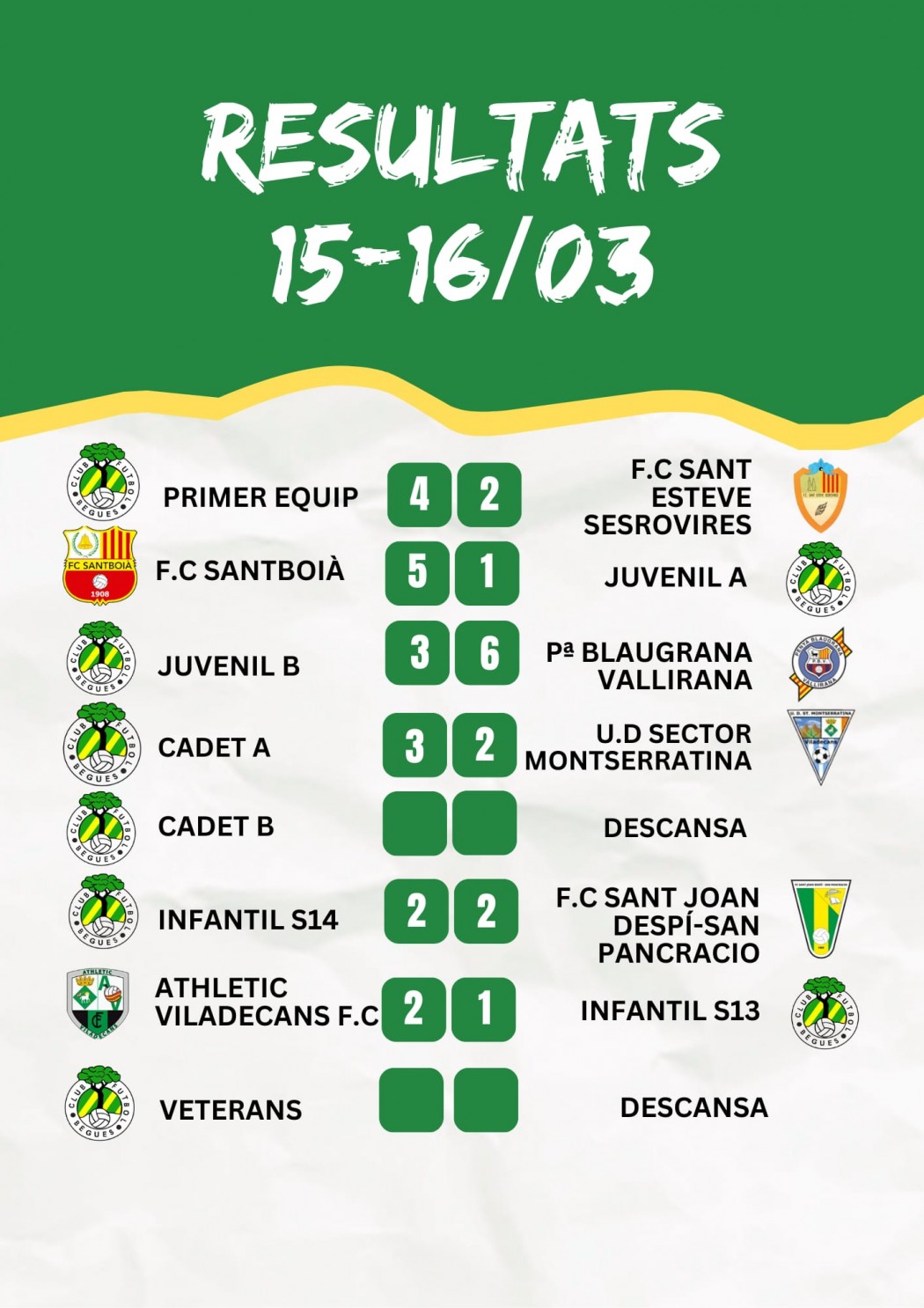 - Primer Equip: Victòria a casa davant d’un rival directe que ens permet agafar confiança per encarar el darrer tram de la temporada. Molt bona primera part on marxem amb 2-0 al descans però a la represa els visitants retallen distàncies i inclús amb un jugador menys empaten en una falta on també ens quedem amb un jugador menys. A partir de l’empat l’equip fa un gran esforç i s’endú una gran victòria.