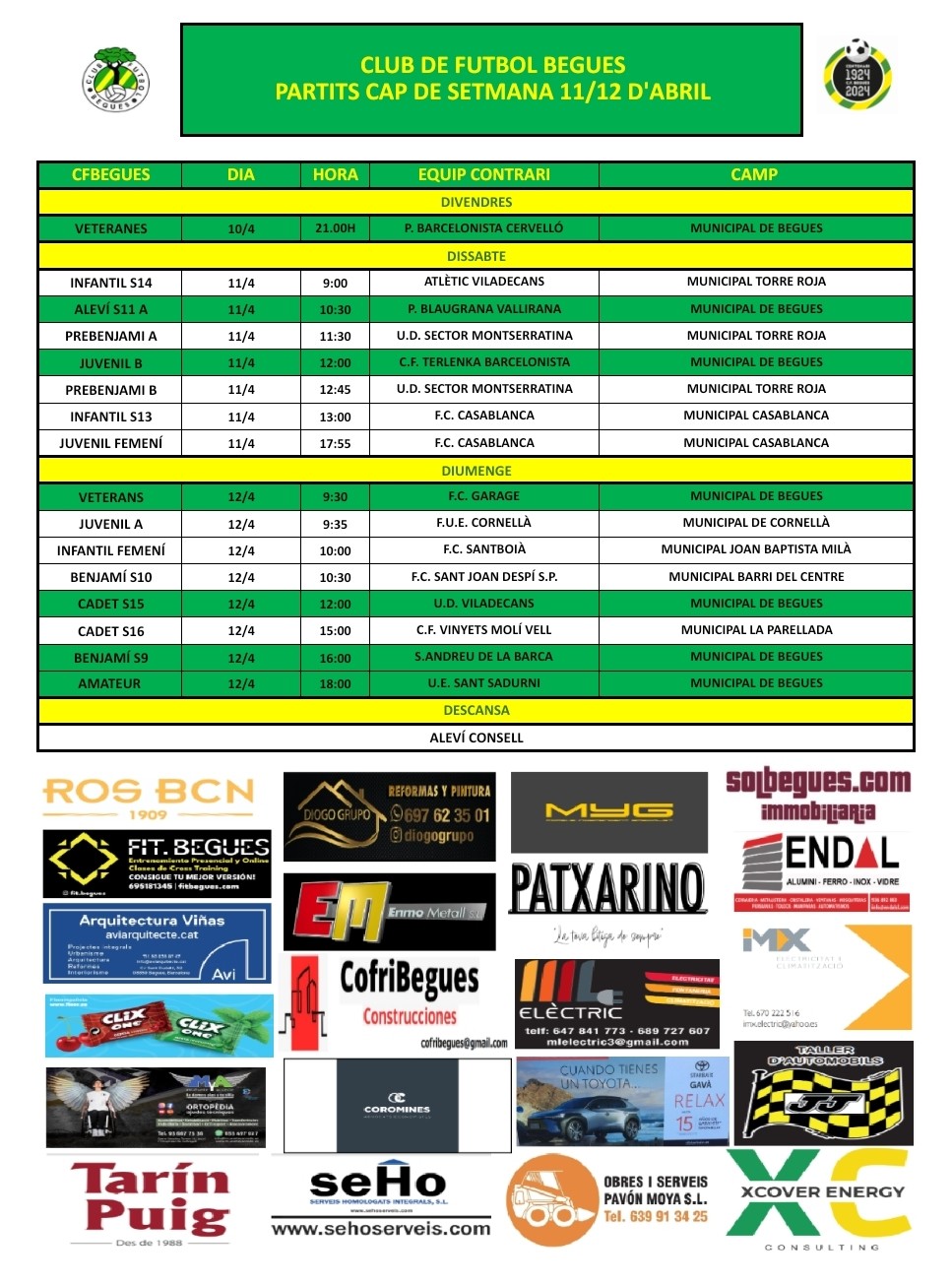 I diumenge a la tarda, dos partits més a Begues. A les 16:00, Semifinal del Play Off d'ascens del Benjamí S9 contra el Sant Andreu de la Barca. I a les 18:00, el Primer equip rep a un rival directe, el Sant Sadurni, sisè classificat a la lliga amb un punt menys que nosaltres