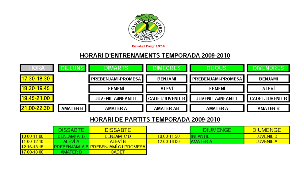 A la imatge adjunta podreu veure els horaris d'entrenament i dels partits que els diferents equips juguin com a locals.