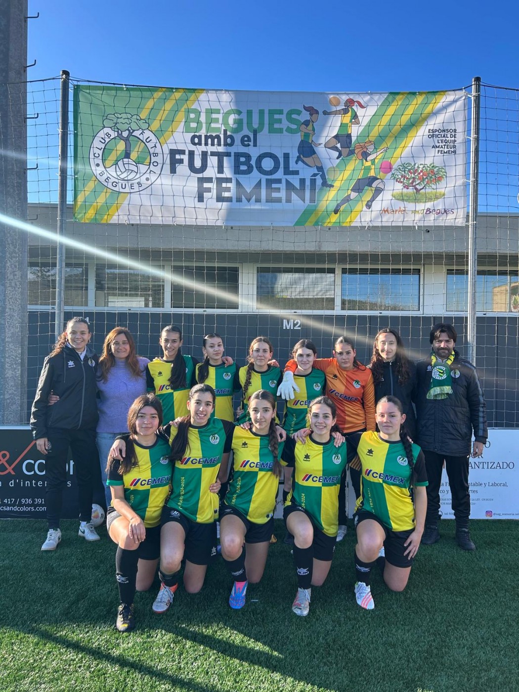 L'equip es va fer una fotografia amb el cartell que hem posat al camp de suport al futbol femení, en el que surt el patrocinador principal de l'equip, Marlet km0 Begues.