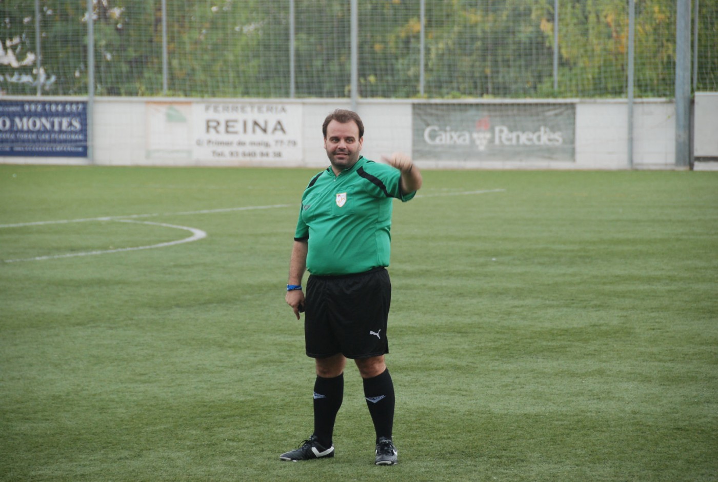 | Els dos capitans amb el trio arbitral al Begues - Castelldefels de la Copa Catalunya |
