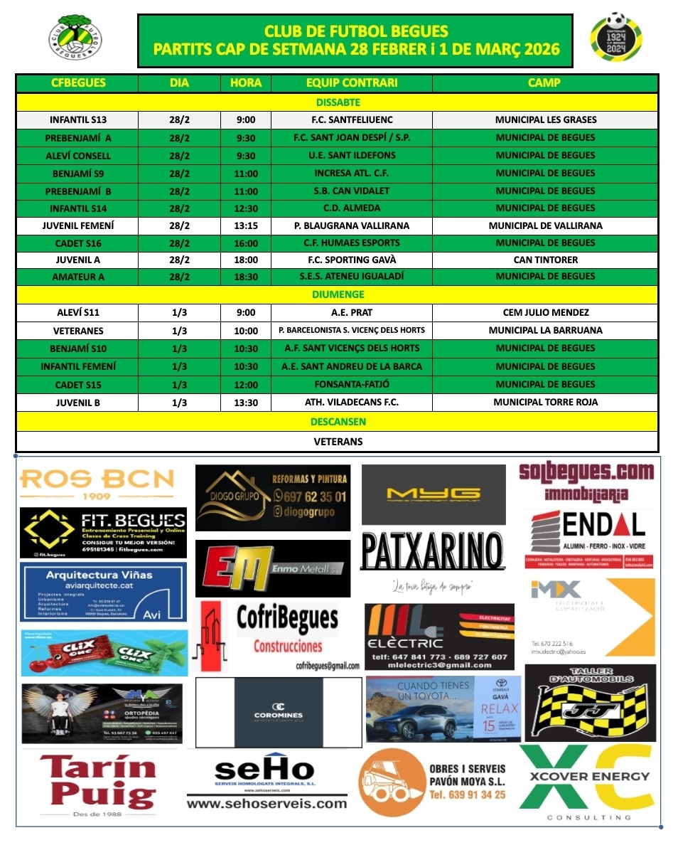 Dissabte a Begues hi ha 7 partits programats. Comencen el Prebenjamí A i l'Aleví Consell, que juguen a les 9:30. A les 11 serà el torn del Benjamí S9, que rep al líder intractable Incresa (que només ha cedit punts contra nosaltres a la primera volta) i el Prebenjami B. A les 12:30, l'Infantil S14, segon, intentarà seguir pressionant al líder.
