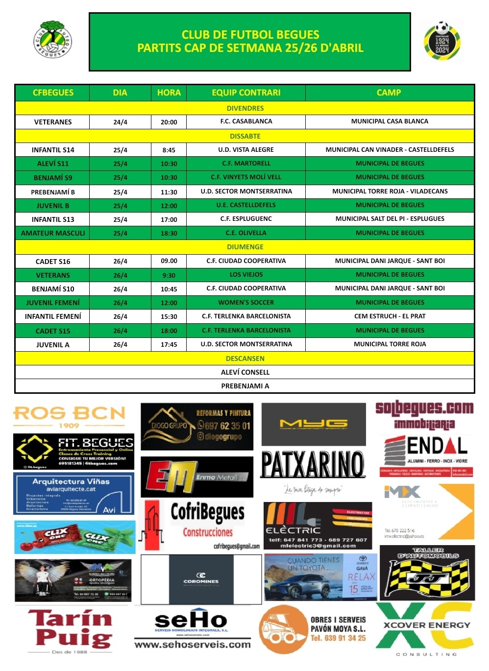 A Begues tenim 7 partits aquesta jornada. Dissabte al matí, a les 10:30, juguen l'Alevi S11 contra el Martorell, cuer de la lliga i el Benjami S9 contra el Vinyets, primer partit del Torneig post-lliga. I a les 12:00 el Juvenil B rep al Castelldefels, rival directe situat només dos punts per sobre nostre. A la tarda, a les 18:30, el Primer equip juga contra un necessitat Olivella, que lluita per sortir del descens, mentre que el nostre equip vol guanyar per mantenir les esperances d'entrar al Playoff d'ascens