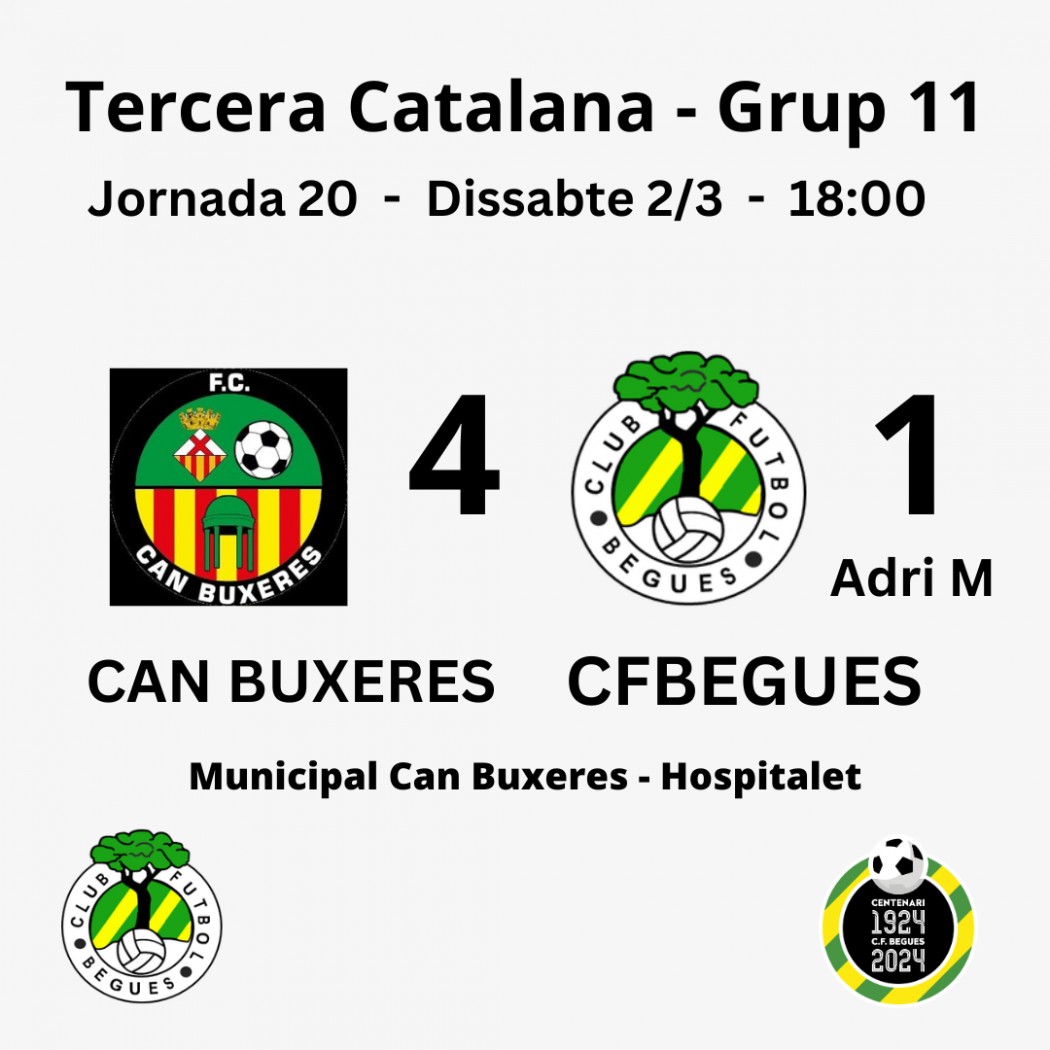 ![]() El primer equip ha perdut 4-1 al camp del Can Buxeres, en un partit en el que els locals han marcat aviat i abans del descans ja guanyaven 3-0 L'equip es presentava amb nombroses baixes i gent tocada, però amb la intenció de plantar cara a un complicat equip de mitja taula, sobretot a casa. Al minut 13, però, s'han començat a complicar les coses quan els locals feien l'1-0. Al minut 33 marcaven el segon, i just abans del descans feien el 3-0 que deixava el partit molt i molt complicat per als nostres jugadors La segona part ha estat més igualada, amb uns locals tranquils amb el marcador i un Begues que no trobava el camí del gol. Al minut 85, el Can Buxeres marcava un dolorós quart gol, i poc abans del final Adri Moreno marcava el gol de l'honor per al Begues Toca passar pàgina i pensar ja en la propera jornada, en la que ens visita La Florida, un dels rivals directes en la part baixa de la classificació. Ànims i a seguir, Begues!!! |