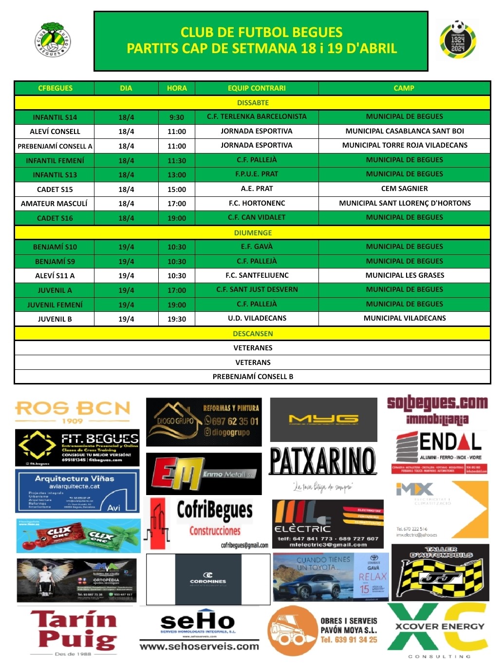 A Begues tindrem 4 partits el dissabte. Al matí, a les 9:30, l'Infantil S14 rep a la Terlenka, amb l'objectiu d'acabar d'assegurar la segona posició a la classificació i seguir pressionant als líders. A les 11:30, l'Infantil femení rep al Pallejà (7e classificat). I a les 13:00 l'Infantil juga contra la Fundació Prat, un dels equips de la zona baixa. Tancarà la jornada de dissabte el Cadet S16, que rep a les 19 al Can Vidalet, tercer classificat