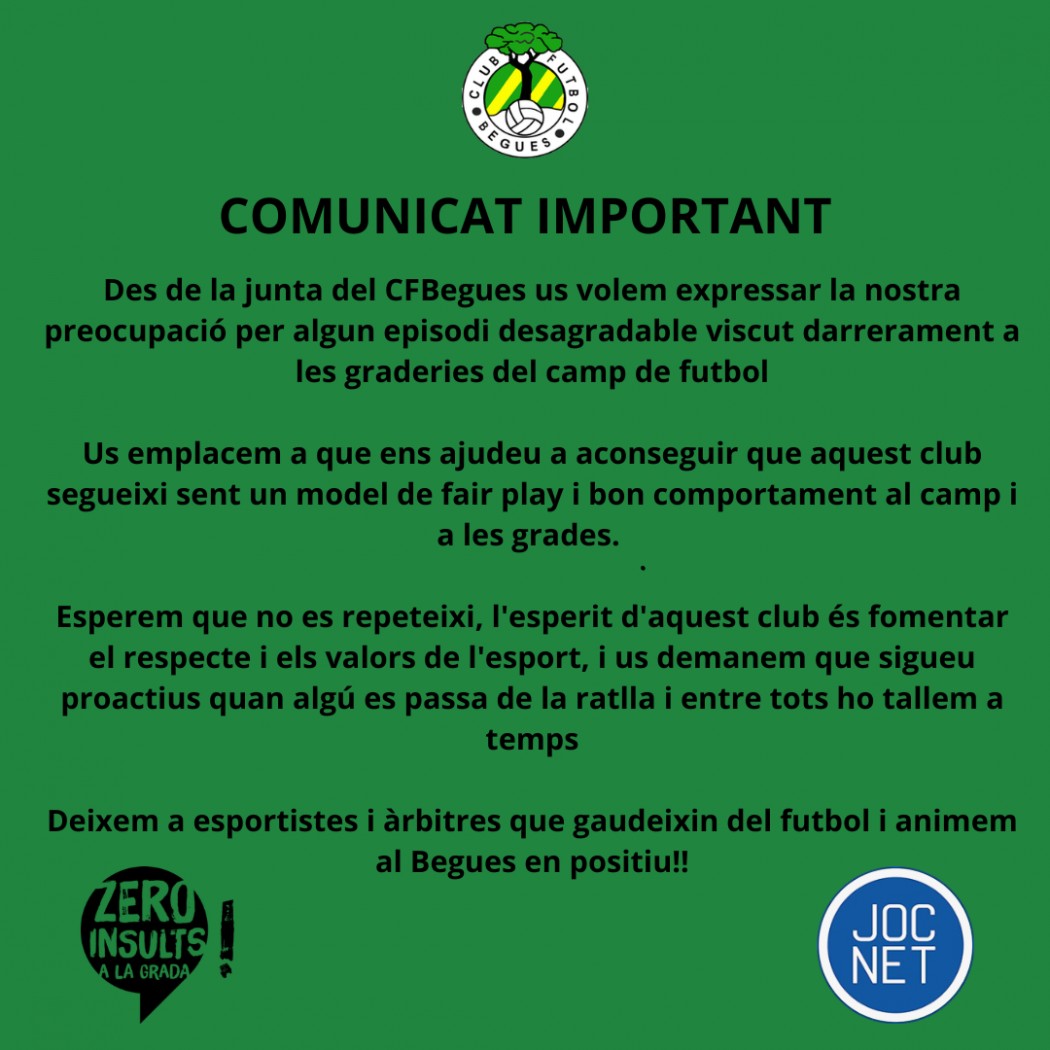 Des de la junta del CFBegues us volem expressar la nostra preocupació per algun episodi desagradable viscut darrerament a les graderies del camp de futbol